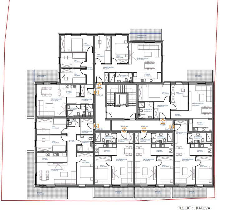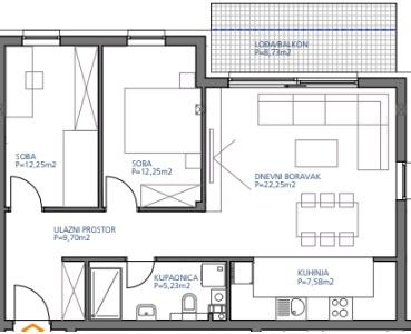 Prodaja dvosobnog stana : dnevni boravak, kuhinja, spavaća soba i kupatilo, veličine 65,12 m2 + lođa/vrt ( nije uračunato u kvadraturu stana ) + obavezna kupnja prkirnog mjesta ( po izboru garažno, natkriveno ili nenatkriveno parkirno mjesto )