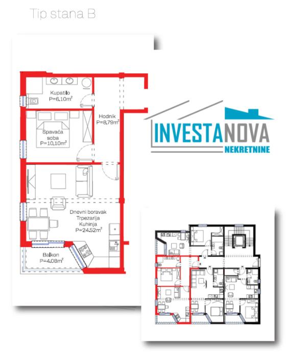 Tip B – Nalaze se u jugozapadnom dijelu zgrade, orijentirani prema jugoistoku. Površina stanova iznosi 51,57 m², a raspored uključuje dnevni boravak s kuhinjom i blagovaonicom (24,52 m²), spavaću sobu (10,10 m²), kupaonicu (6,10 m²), hodnik (8,79 m²) i balkon (4,08 m²).