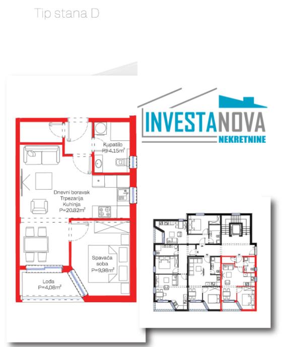 Tip D – Smješteni u jugoistočnom dijelu objekta, svi stanovi imaju otvoren pogled na more. Površina iznosi 42 m², a stanovi se sastoje od dnevnog boravka s kuhinjom i blagovaonicom (20,82 m²), spavaće sobe (9,98 m²), kupaonice (4,15 m²), ostave (2,10 m²) i lođe (4,08 m²).