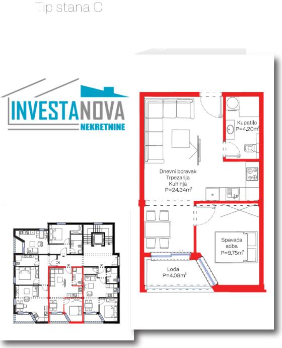 Tip C – Središnji položaj u zgradi s jugoistočnom orijentacijom. Površina stanova iznosi 41,30 m², a uključuju dnevni boravak s blagovaonicom (24,34 m²), spavaću sobu (9,75 m²), kupaonicu (4,20 m²) i lođu (4,08 m²).