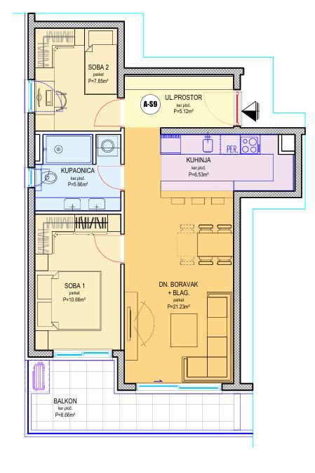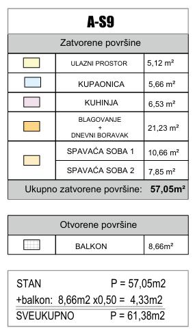 Navedeni model dvosobnog stana 61,38m2 također imamo u ponudi i na sljedećim etažama: suteren, prizemlje, 1.kat, 2.kat.
