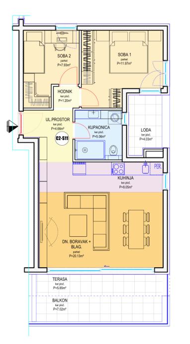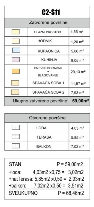Navedeni model dvosobnog stana 68,46m2 se nalazi na 3.katu (zadnji kat). Cijena: 444.990,00€.