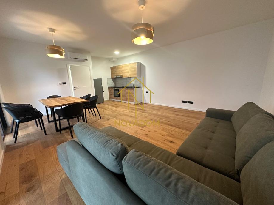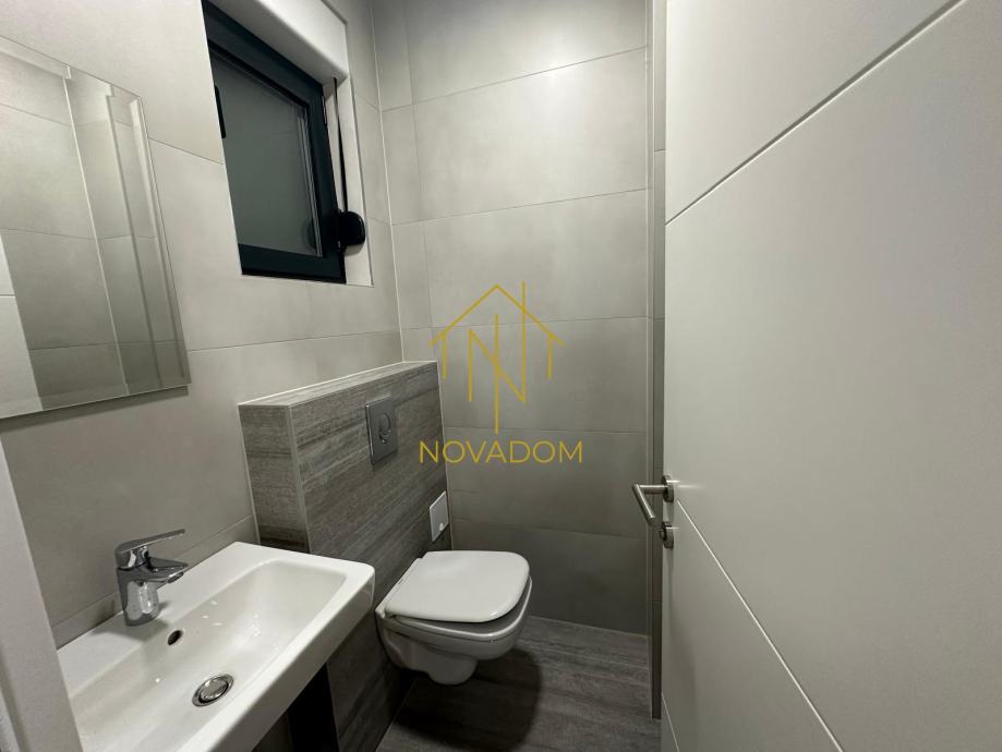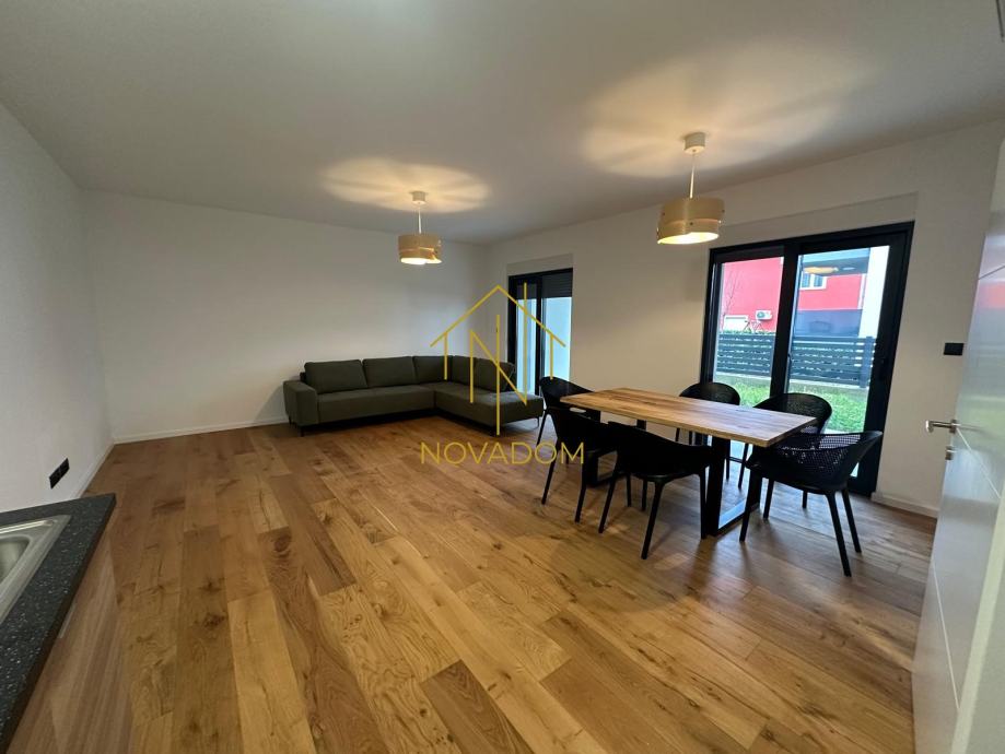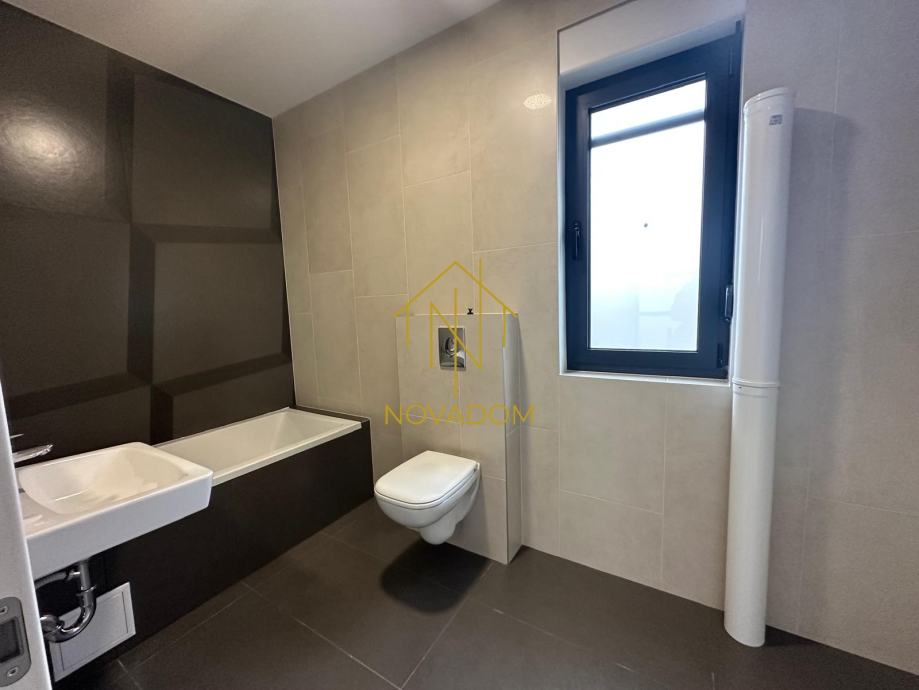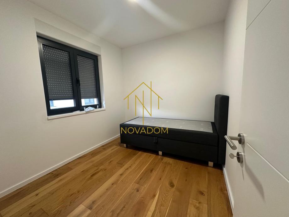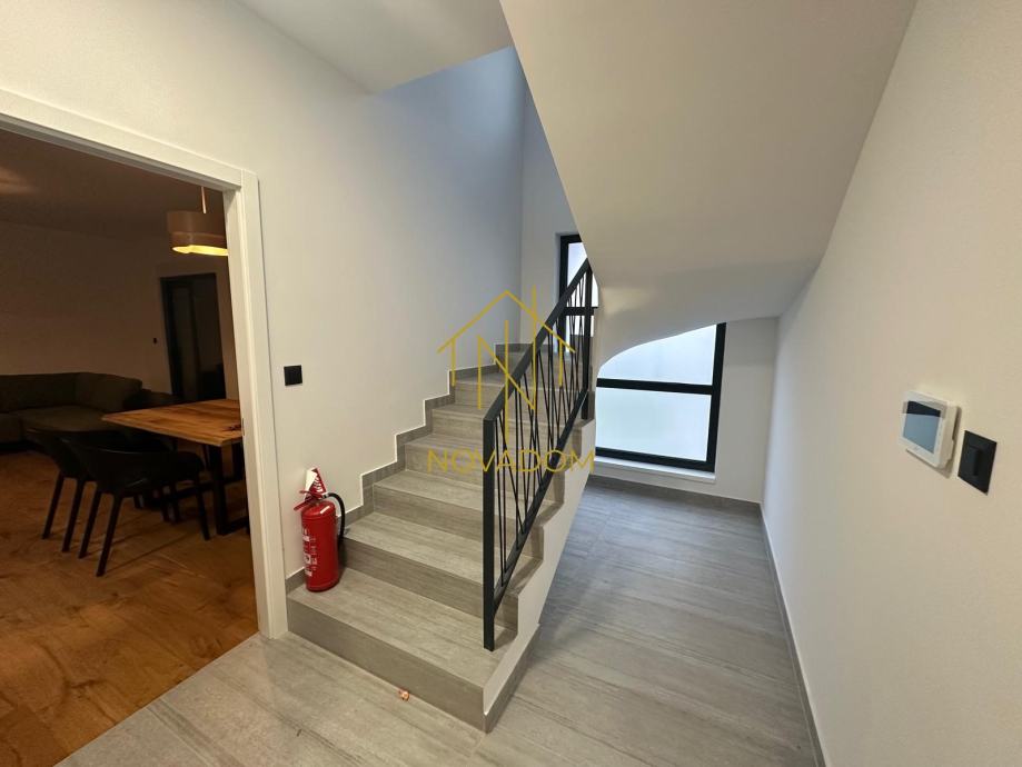 Dvoetažni 4s stan (110m2). Stan se sastoji od prostranog dnevnog boravka s blagovaonom i kuhinjom, privatnog vrta i zasebnog wc-a u prizemlju. Na katu se nalaze tri spavaće sobe od kojih je jedna bračna soba s graderobom predviđena za walk-in ormar te kupaone s wc-om. (Prilikom gradnje korišteni su vrhunski materijali, uključujući aluminijsku stolariju, električne podizače za rolete, podno grijanje, klimatizirane prostorije). Izvanstandardna visina stropova (2,80m). Mogućnost parkinga za 2 automobila u dvorištu zgrade.