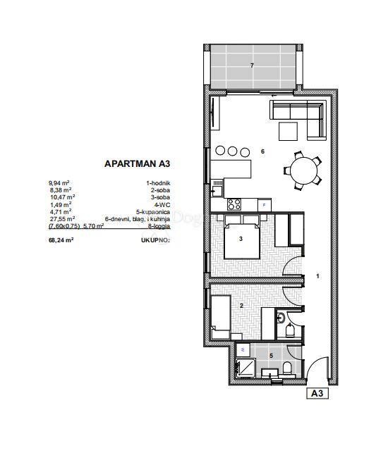 Netto površina stambenog prostora je 60,64 m², a brutto površina s terasom 68,24 m².
