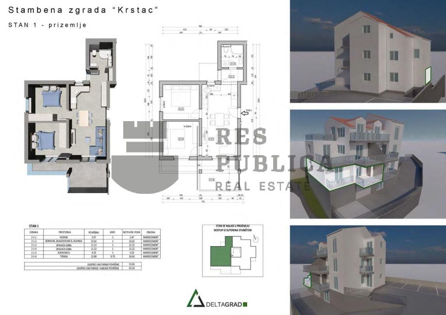 Stan se nalazi u prizemlju stambene zgrade koja ukupno ima 5 stanova raspoređenih na 4 etaže. U suterenu zgrade se nalazi ulaz, šupe i garaža koja pripada penthouse stanu u potkrovlju, a na ostale dvije etaže su smještena po dva stana.