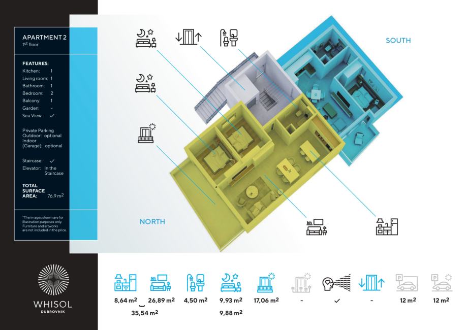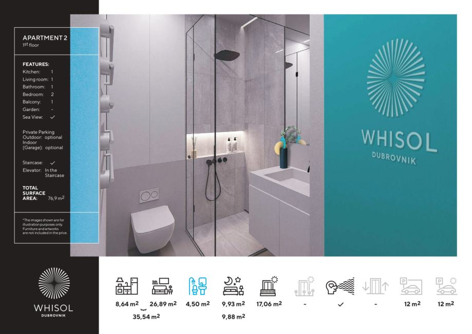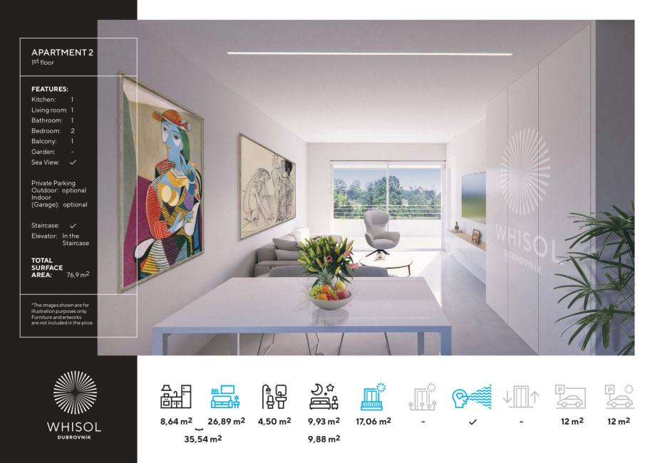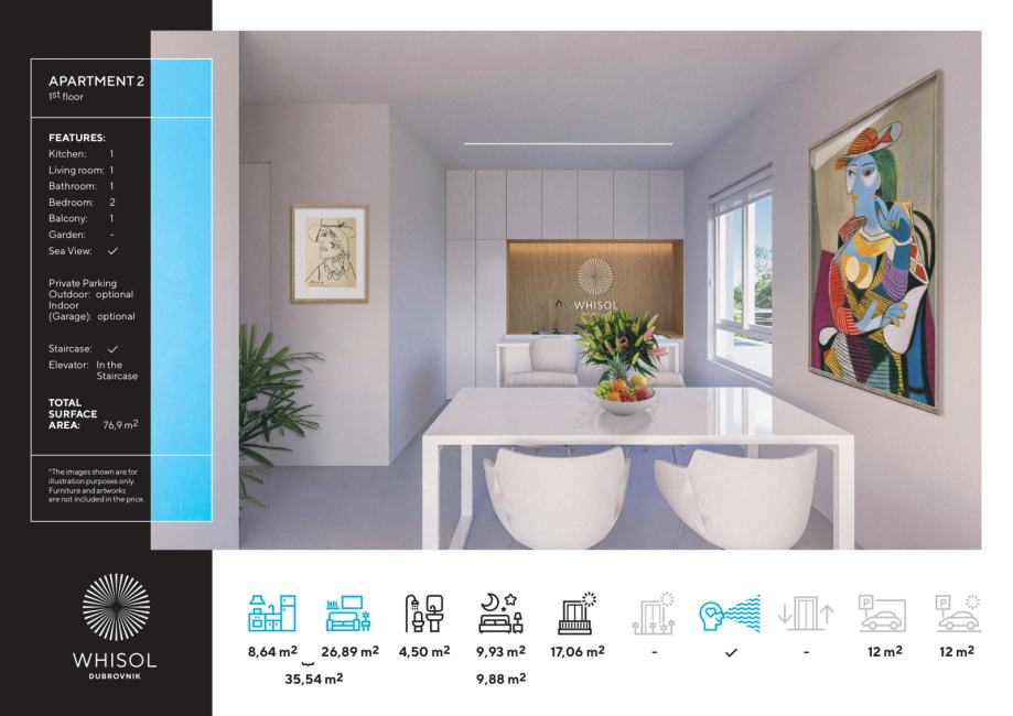 - Sastoji od dvije spavaće sobe, jedne kupaonice, svijetlog dnevnog boravka povezanog sa kuhinjom i blagovaonicom.