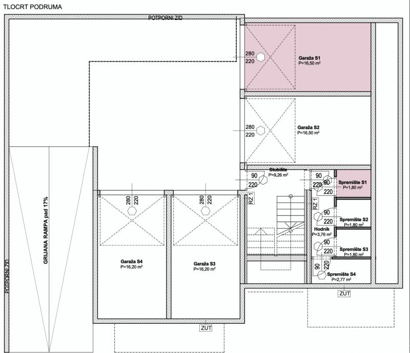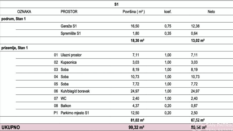 Stan P2-S1 - prizemlje (orijentacija J - Z) - stambena neto površina 64,15 m2 (3 spavaće sobe + kupaonica + WC) + balkon (4,37 m2) + spremište1 (1,80 m2) + vanjsko parkirno mjesto + garažno parkirno mjesto, ukupno neto obračunska površina 80,54 m2 = 257.728 EUR (s uključenim PDV-om)