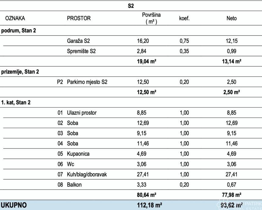 Stan P1-S2 - 1. kat (orijentacija: S - I - J - Z) - stambena neto površina 77,31 m2 (3 spavaće sobe + kupaonica + WC) + balkon (3,33 m2) + spremište2 (2,84 m2) + vanjsko parkirno mjesto + garažno parkirno mjesto, ukupno neto obračunska površina 93,62 m2 = 299.584 EUR (s uključenim PDV-om)