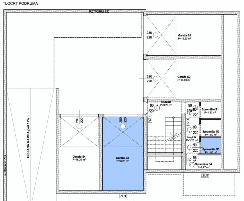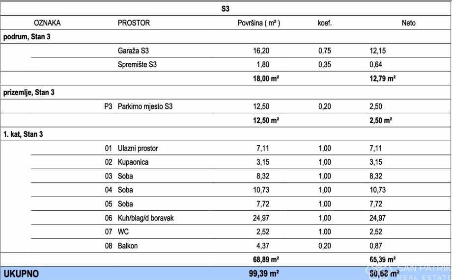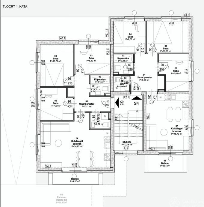 Stan P2-S4 - 1. kat (orijentacija J - I) - stambena neto površina 58,29 m2 (3 spavaće sobe + kupaonica + WC) + balkon (4,61 m2) + spremište4 (2,77 m2) + vanjsko parkirno mjesto + garažno parkirno mjesto, ukupno neto obračunska površina 74,84 m2 = 284.544 EUR (s uključenim PDV-om)