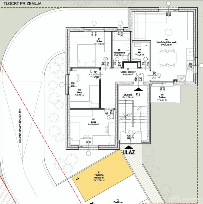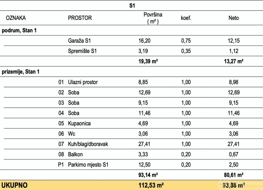 Stan P1-S1 - prizemlje (orijentacija S - I - J - Z) - stambena neto površina 77,44 m2 (3 spavaće sobe + kupaonica + WC) + balkon (3,33 m2) + vrt (70 m2) spremište1 (3,19 m2) + vanjsko parkirno mjesto + garažno parkirno mjesto, ukupno neto obračunska površina 100,88 m2 = 322.816 EUR (s uključenim PDV-om)