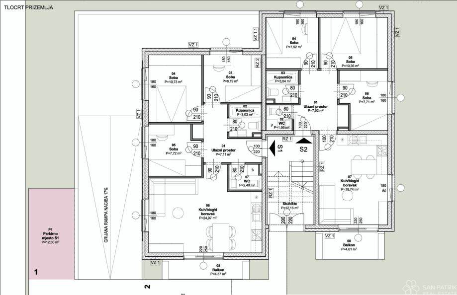 Stan P3-S2 - prizemlje (orijentacija J - I) - stambena neto površina 57,84 m2 (3 spavaće sobe + kupaonica + WC) + natkriveni balkon (5,09 m2) + dvorište (162 m2) + spremište1 (1,80 m2) + vanjsko parkirno mjesto + garažno parkirno mjesto, ukupno neto obračunska površina 89,94 m2 = 287.488 EUR (s uključenim PDV-om)