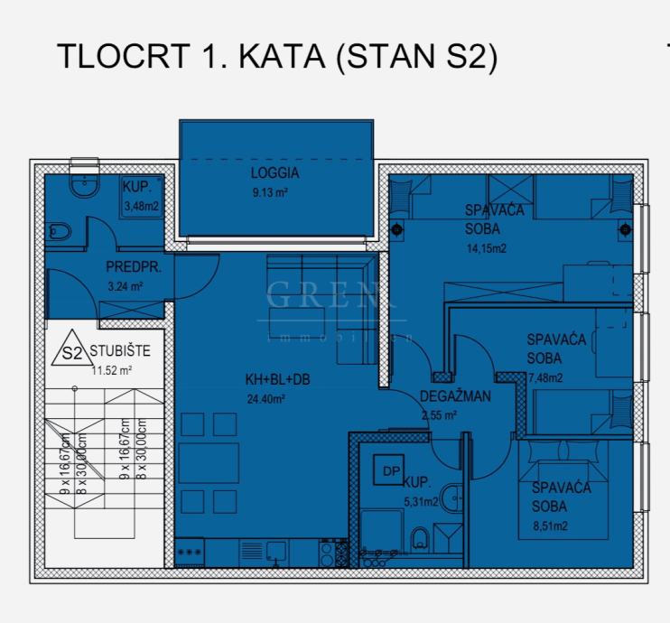 • Loggia: 9,13 m2 bruto,6,85m2 neto(koeficijent 0,75)