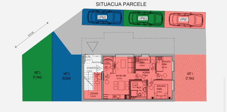 Radi se o dvojnoj kući s po 3 stana sa svake strane – po jedan stan na svakoj etaži, što znači da svaki ulaz ima ukupno 3 stana (prizemlje, kat i uvučeni kat/potkrovlje).