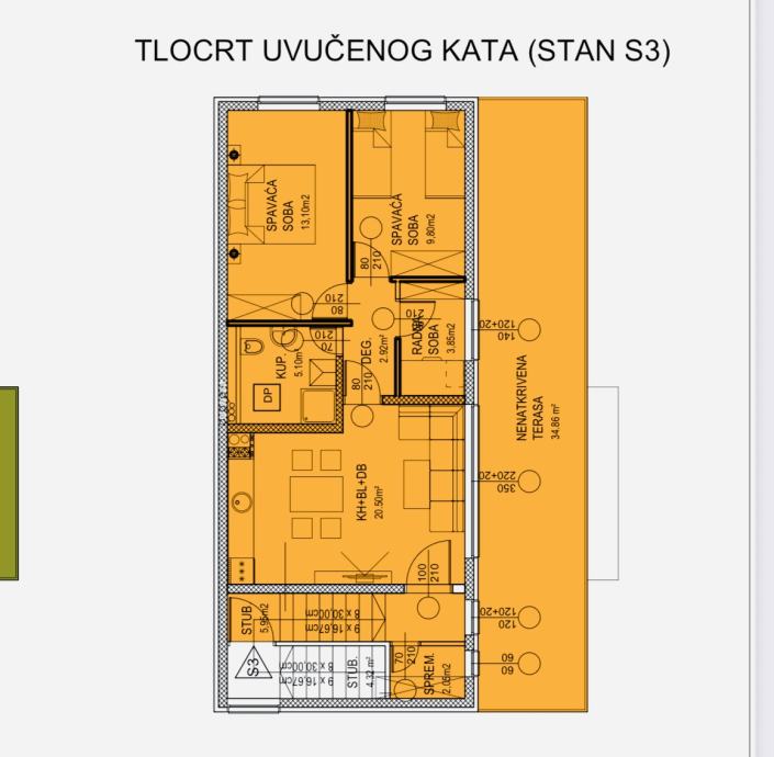 Prodaje se troiposobni stan S3 na drugom uvučenom katu, 134,46m2 bruto, 76,86m2 neto,s terasom,vrtom i jednim parkirnim mjestom.