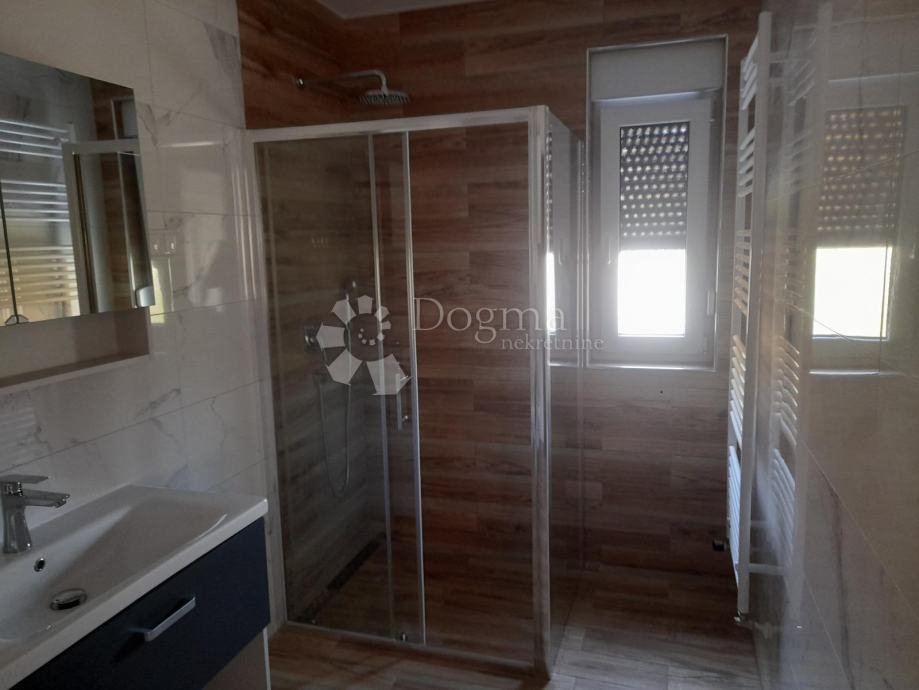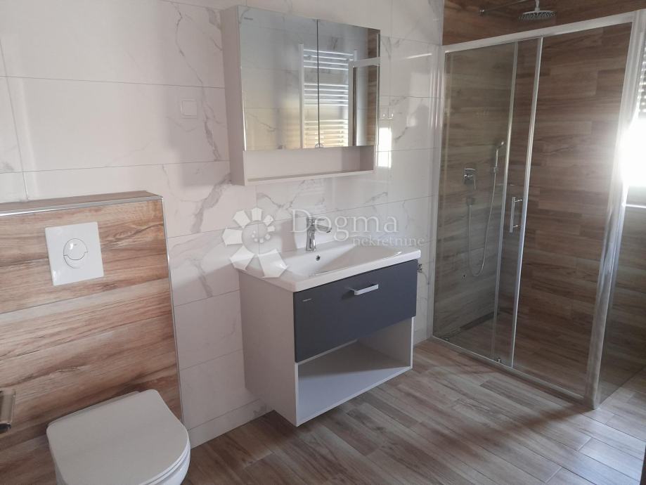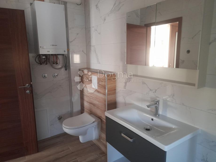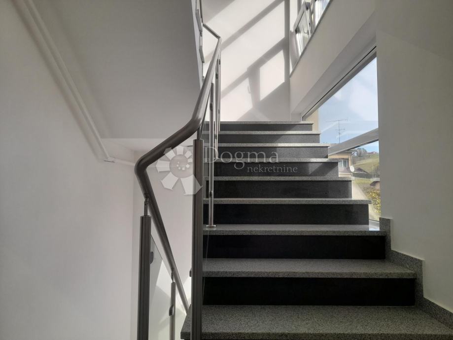 Stan je četverosobni, a sastoji se od ulaznog prostora, wc-a za goste, blagovaonicom povezanom s dnevnim boravkom, kuhinjom, prostranom lođom, dok je odvojeni spavaći dio i kupaonica od zajedničkog prostora na prvoj etaži. Drugu etažu stana čine hodnik/galerija, te dvije spavaće sobe i kupaonica. Vanjska ulazna vrata su protuprovalna, sva unutarnja stolarija je drvena, podovi svih prostorija su pločice koje imitiraju drvo, vanjska stolarija je PVC koja je s vanjske strane antracit, a s unutrašnje strane bijela, rolete u dnevnom boravku su na struju, u ostalim sobama na povlačenje. Grijanje je podno plinsko, gradski vodovod i struja su u stanu, a postoji mogućnost i kamina ili peći na kruta goriva. Uređenost i namještenost stana odnosi se na ugradbenu kuhinju sa hladnjakom s dvostrukim vratima, kaučom u dnevnom boravku i uređenim sanitarijama. Stam je trenutno u Roh Bau varijanti, a fotografije prikazuju kako se uređuje za budućeg kupca.