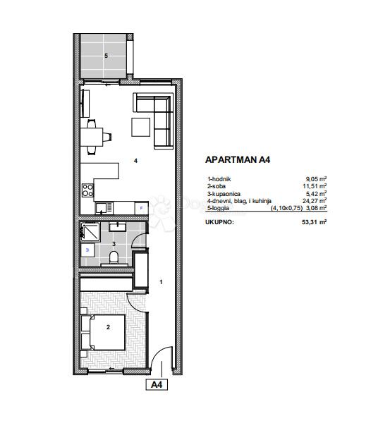 Netto površina stambenog prostora je 50,29 m², a brutto površina s terasom 53,31 m².