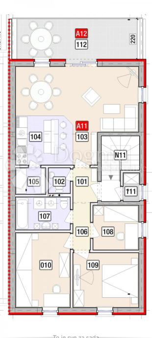 Stan se sastoji od ulaznog prostora, dnevnog boravka s kuhinjom i blagovaonicom, izbe, vešeraja, kupaonice, hodnika, 3 spavaće sobe, 2 parkirna mjesta.