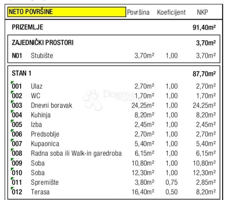 Stan S1 se nalazi u prizemlju stambene površine 87.70m2 sa terasom od 16m2 i vrtom od 100m2 te sa 2 parking mjesta.