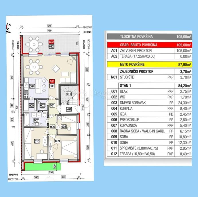Stan se sastoji od ulaznog prostora, dnevnog boravka s kuhinjom i blagovaonicom, izbe, vešeraja, kupaonice, hodnika, 3 spavaće sobe, 2 parkirna mjesta.