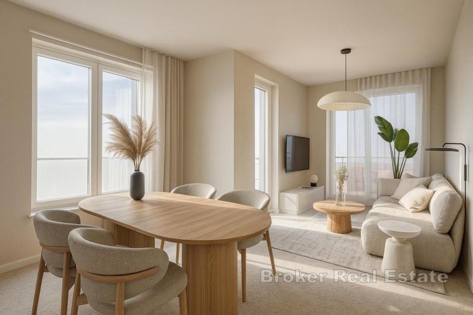 Stan se nalazi na drugom katu te ima ukupnu neto površinu od 65 m². Sastoji se od ulaznog hodnika, prostranog dnevnog boravka povezanog s kuhinjom i blagovaonicom, s izlazom na balkon, dvije spavaće sobe i kupaonice. Balkon je južne orijentacije i pruža lijep pogled na more, čime je prostoru osigurano obilje prirodnog svjetla tijekom cijelog dana.