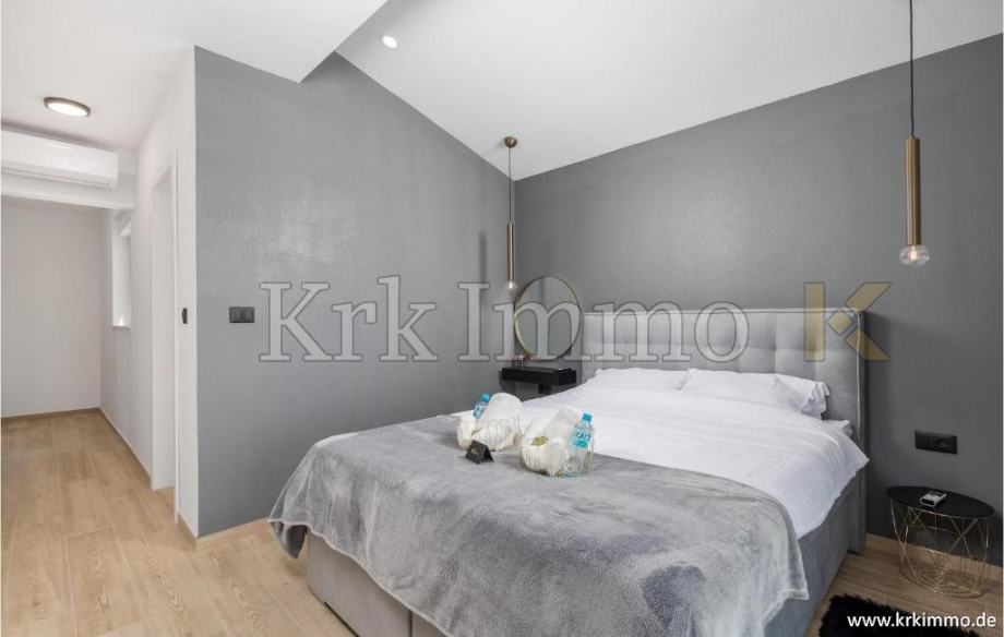 Kuća se nalazi na izrazito mirnoj lokaciji u okolici Vrbnika na rubu građevinske zone. U blizini su svi potrebni sadržaji za ugodan život. Ova impozantna kuća modernog dizajna savršena je za one koji traže luksuzan životni prostor u mirnom okruženju, ali i blizini svih sadržaja koje pruža život na otoku Krku.
