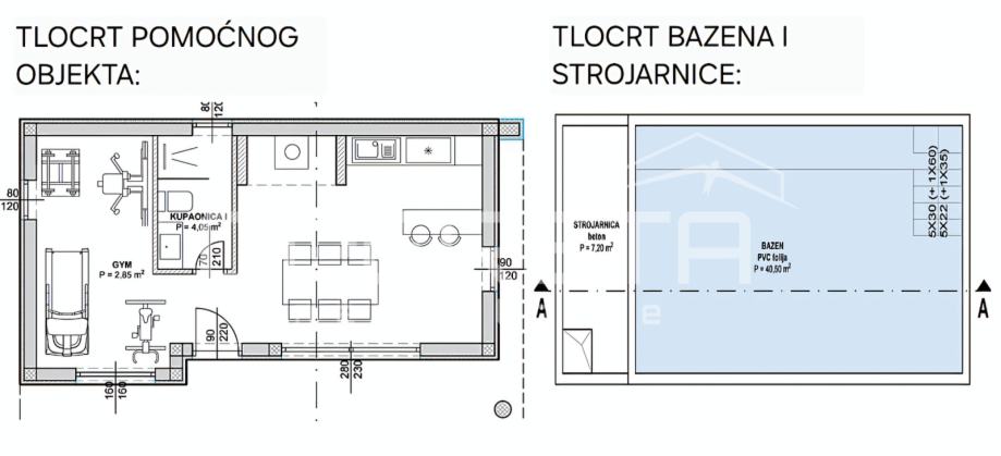 Uz kuću se nalazi pomoćni objekt sa ljetnom kuhinjom, teretanom i kupaonicom.