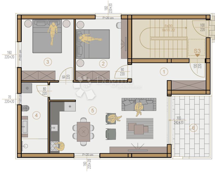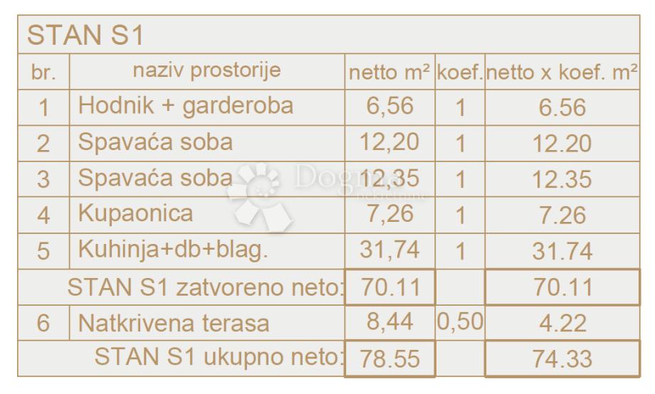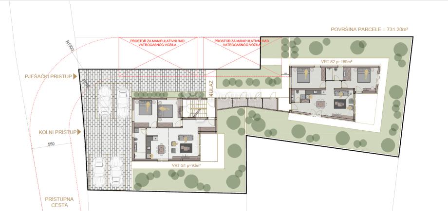 Stanovi u prizemlju sastoje se od hodnika, dvije spavaće sobe, kuhinje s blagovaonicom i dnevnim boravkom u open space izvedbi, kupaonice te dvorišta. Dok su stanovi na katu veći za jedna wc, odnosno gostinjski dodatni wc.