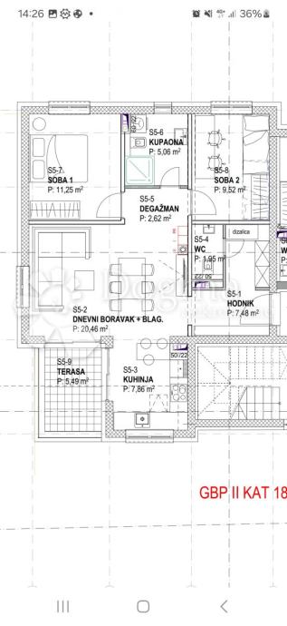Stan S5 nalazi se na drugom katu a sastoji se od hodnika, dvije spavaće sobe, kupaonica sa WC-om, zasebnog Wc,-a, kuhinje s a dnevnim boravkom iz kojeg je izlaz na prostranu terasu. U stan će biti ugrađene vrlo kvalitetne keramičke pločice i parketi poznatih proizvođača.