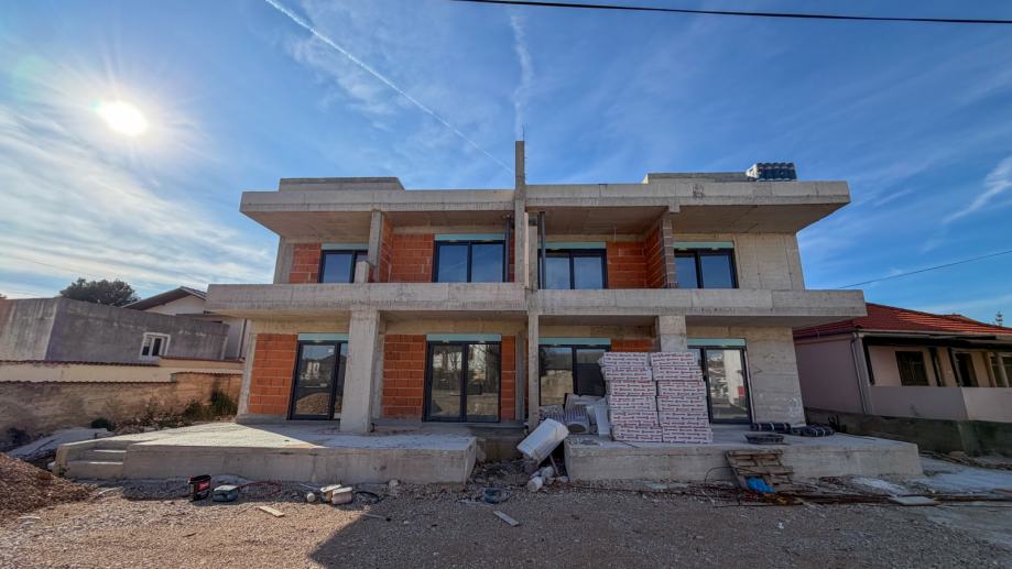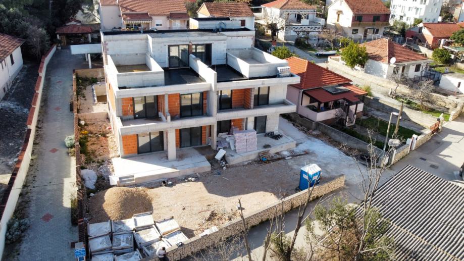 Predmetni stan se nalazi na prednjoj lijevoj strani, gledajući s mora. Stan se sastoji od prizemlja gdje se nalazi dnevni boravak i kuhinja od 49m2, spavaća soba od 12.64m2, kupaonica, wc te natkrivena terasa. Na prvom katu se nalaze 3 spavaće sobe i tri kupaonice, natkrivena terasa i loggia i izlaz na krovnu terasu gdje se nalazi prostorija za tehniku, pomoćni wc i terasa od 23,77m2