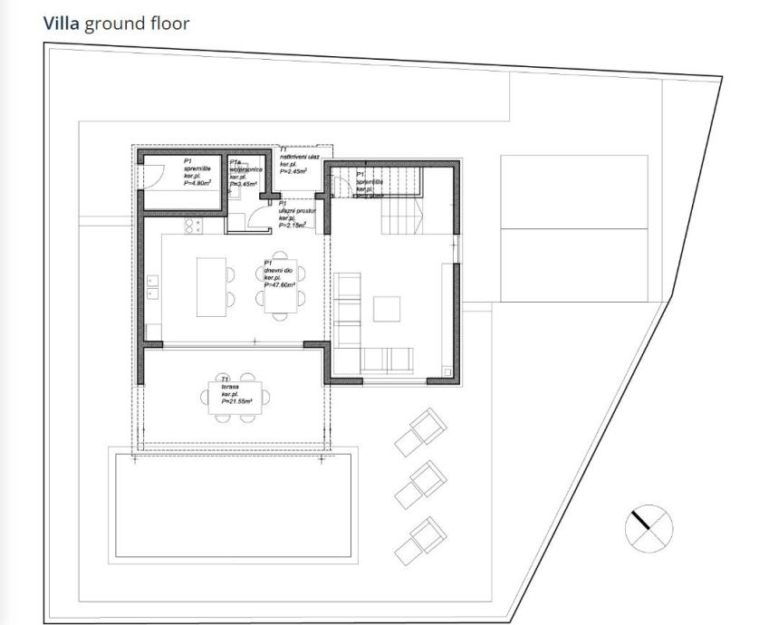 U prizemlju se nalazi ulazni dio, ostava, toalet, dnevni boravak s kuhinjom i blagovaonom te natkrivena terasa.