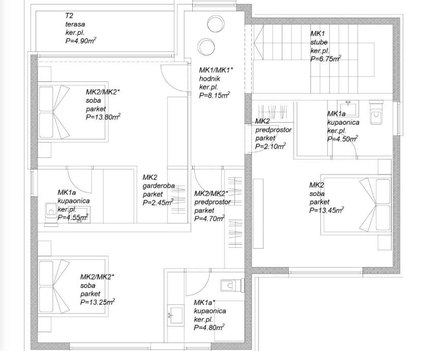 Unutarnjim stubištem se ide na kat gdje se nalaze tri spavaće sobe - svaka s vlastitom kupaonicom, a jedna od njih ima i garderobu i vlastitu terasu.