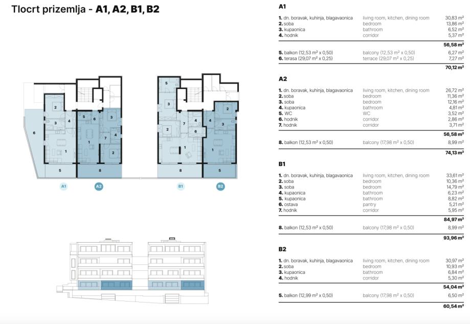 Okoliš zgrada bit će uređen i zasađen mediteranskim biljkama, a svi stanovi su otvorenog pogleda u mirnom okruženju blizu grada.
