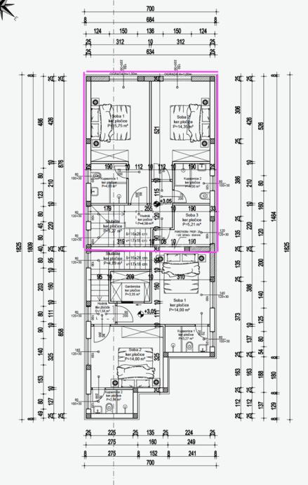 Kuća stambene površine cca.156 m², proteže se na podrum, prizemlje i kat. U podrumu se nalazi garaža i spremište. U prizemlju je hodnik, ostava/vešeraj, toalet, kuhinja s blagovaonicom i dnevnim boravkom i terasa s uređenom okućnicom. Stubište vodi na kat gdje se nalaze tri spavaće sobe, dvije imaju vlastitu kupaonicu. Na raspolaganju je jedno vanjsko parkirno mjesto i garaža.