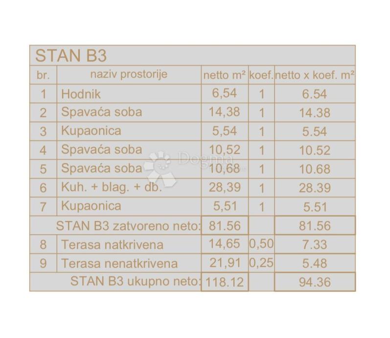 - korisna stambena površina 118,12m2, dva parking mjesta 25m2 (s koef. stan 94,36m2 + 2x park. 2,50m2 = 99,36m2)
