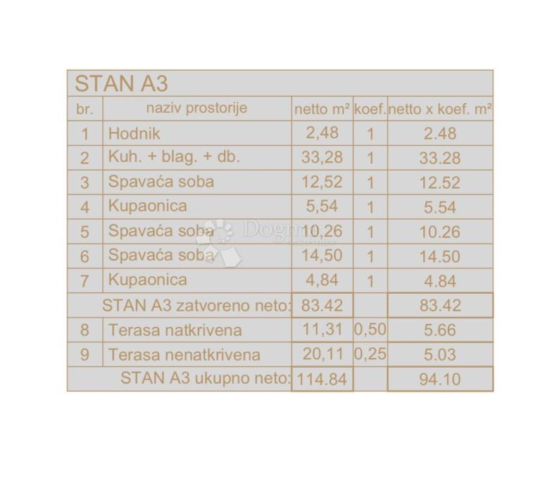 - korisna stambena površina 114,84m2, dva parking mjesta 25m2 (s koef. stan 99,13m2 + 2x park. 2,50m2 = 99,10m2)