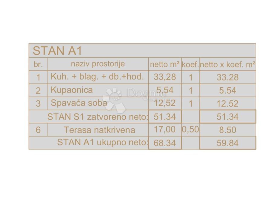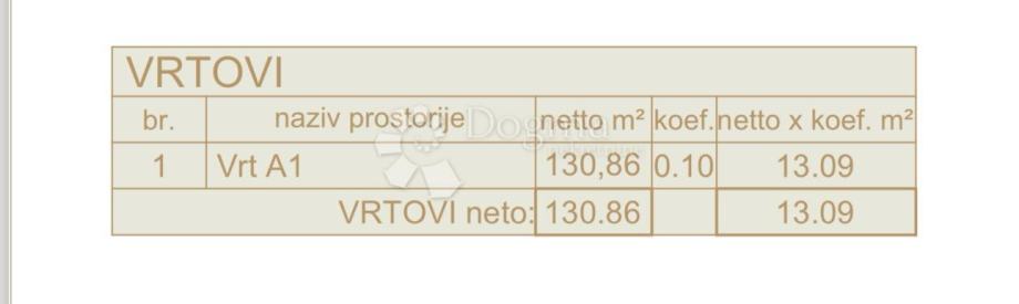 - korisna stambena površina 68,34m2, VRT 130,86m2, parking mjesto 12,50m2 (s koef. stan 59,86m2 + vrt 13,09m2 + park. 2,50m2 = 75,43m2)