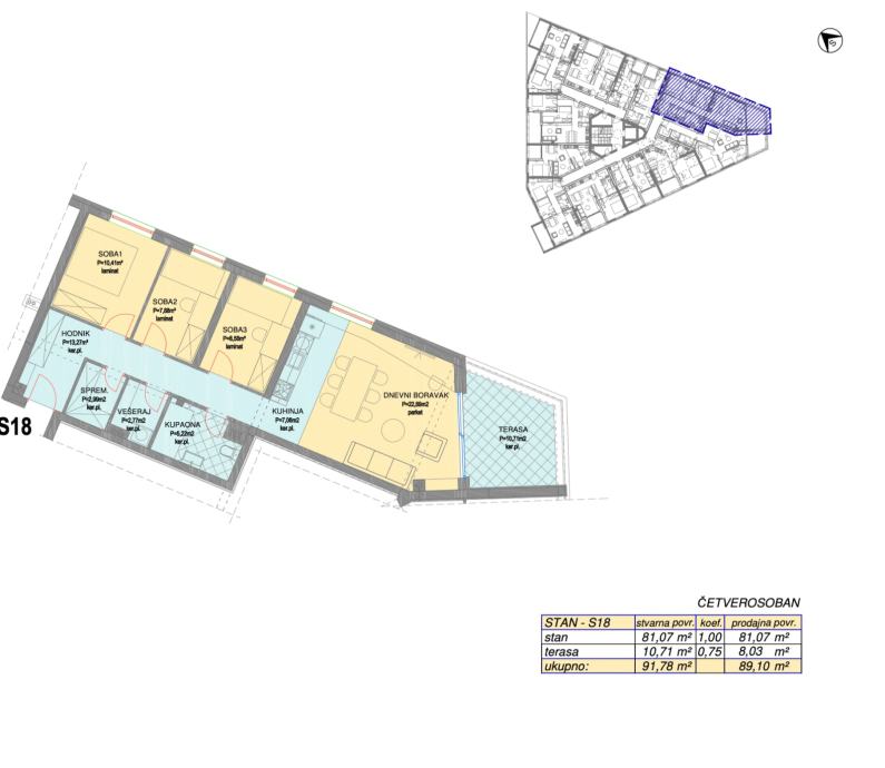 Stan se satoji od: ulazni prostor, tri spavaće sobe, spremište, vešeraj, kupaona, kuhinja+blagovaona+dnevni boravak + izlaz na terasu.