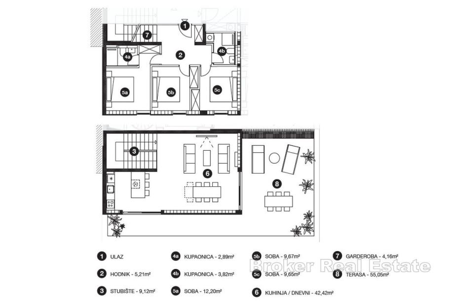 Na drugom katu zgrade A smješten je atraktivan dvoetažan stan S8, koji se sastoji od predsoblja s garderobom, tri spavaće sobe, dvije kupaonice te unutarnjeg stubišta koje vodi na gornju etažu. Na drugoj etaži nalazi se prostrani dnevni boravak otvorenog koncepta, povezan s kuhinjom i blagovaonicom te izlazom na veliku terasu površine 55 m².