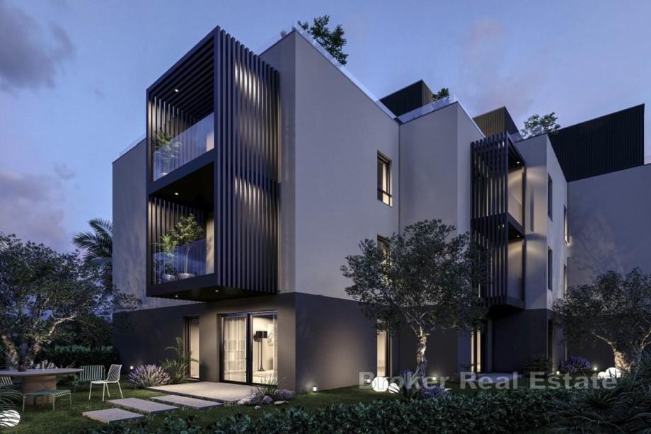Zgrada je zamišljena kao spoj suvremenog dizajna i mediteranskog ugođaja, s prostranim terasama i pomno uređenim okolišem.