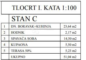 Stan se sastoji se od dnevnog boravka s kuhinjom, koji čine otvoren i svijetao prostor za boravak. Hodnik vodi do spavaće sobe te suvremeno opremljene kupaonice. Iz dnevnog boravka izlazi se na terasu, savršeno mjesto za jutarnju kavu ili opuštanje nakon radnog dana.