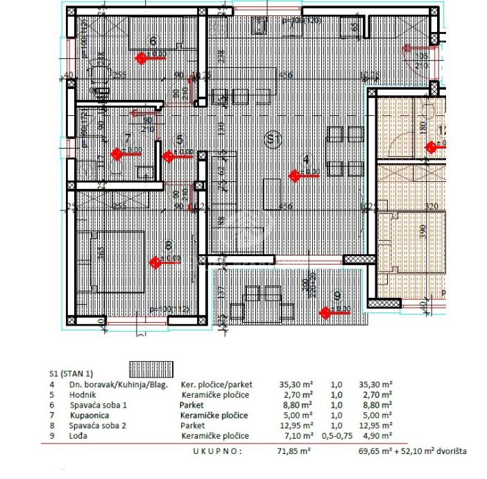 Ukupna površina stana iznosi 69,65 m2, uz pripadajuće dvorište površine 52,10 m2, ukupne netto korisne površine (sa obračunatim koeficijentom) 74,86 m2 što ovu nekretninu čini izuzetno rijetkom i atraktivnom u ponudi novogradnje.