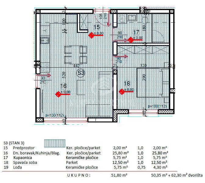 Ukupna površina stana iznosi 50,35 m2, uz pripadajuće dvorište površine 62,30 m2, ukupne netto korisne površine (sa obračunatim koeficijentom) 56,58 m2 što ovu nekretninu čini izuzetno rijetkom i atraktivnom u ponudi novogradnje.