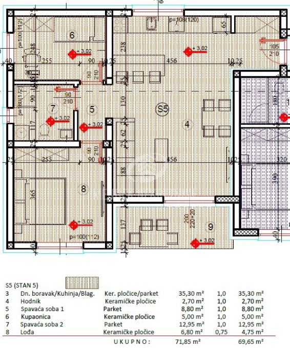 Ukupna neto korisna površina stana iznosi 69,65 m2.