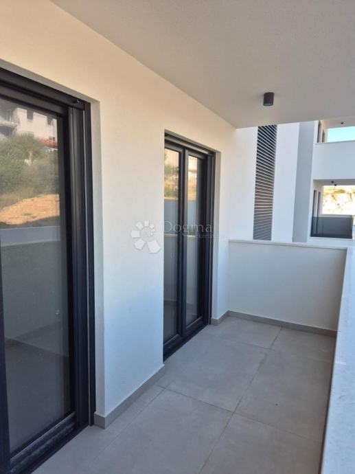 Na prodaju je moderan stan u visoko kvalitetnoj novogradnji u Okrugu Gornjem, udaljen svega manje od 150 metara od mora i plaže.