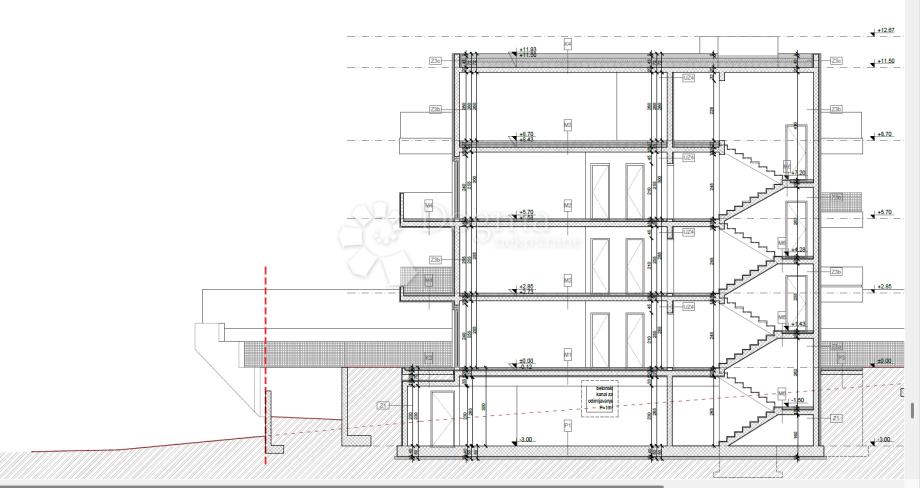 dva stepeništa, svako s liftom (istočno s 2, zapadno s 3 stana po etaži)