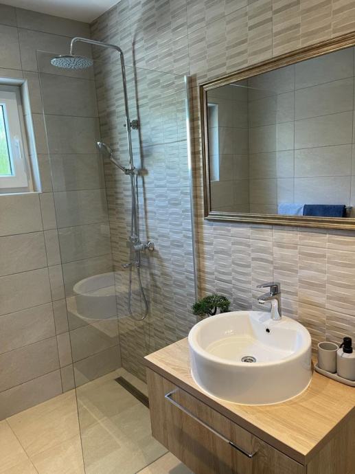 U prizemlju se nalazi kuhinja sa blagovaonom, prostrani dnevni boravak kroz koji se izlazi na terasu s bazenom i vanjskim roštiljem i 2 spavaće sobe sa kupaonicama( walk in tuš ).