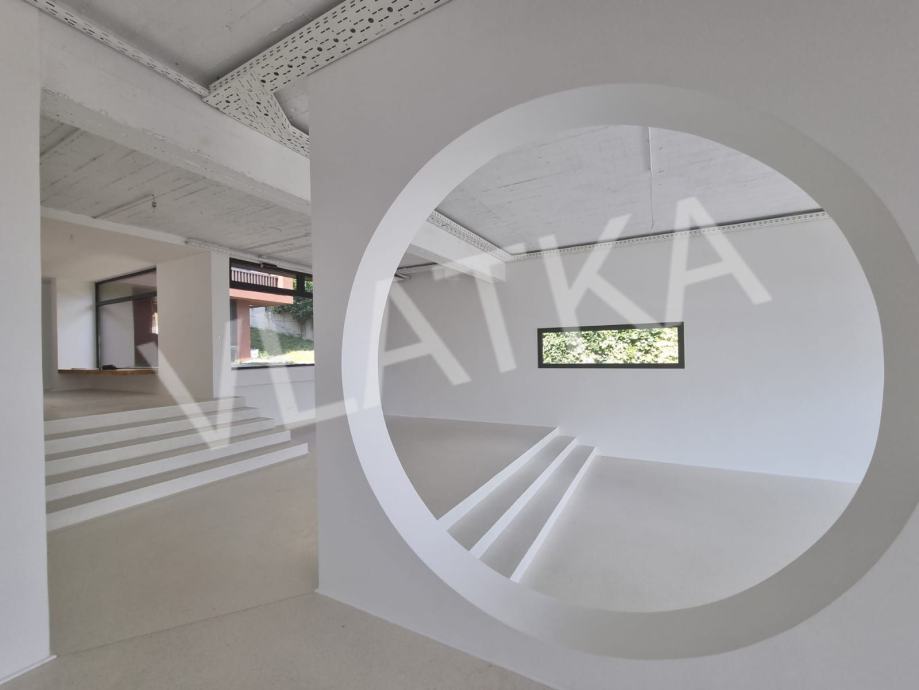 Prizemlje: ulazni hodnik, spavaća soba s kupaonicom, prostran dnevni boravak, kuhinja s blagovaonicom, terasa, bazen, vrt, vešeraj, soba za pomoćnicu sa zasebnim ulazom.