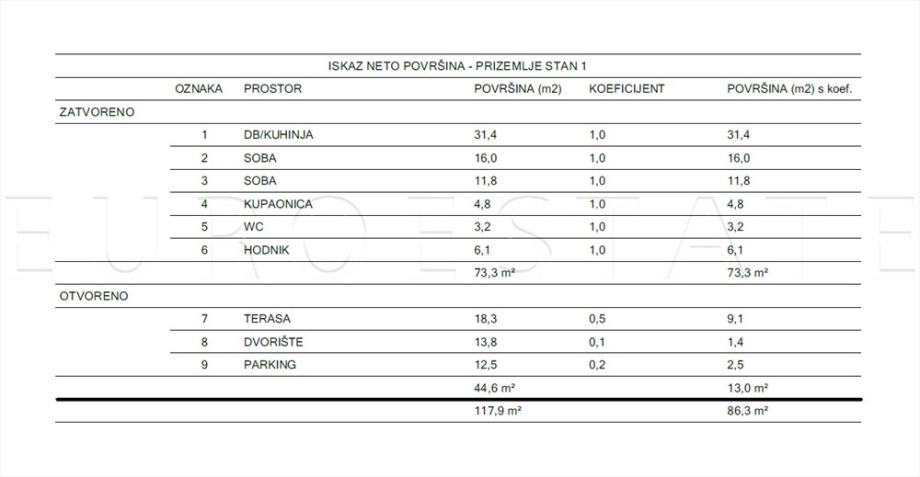 PRODAJE SE trosoban stan u ekskluzivnoj novogradnji smješten u prizemlju urbane vile, ukupne površine 117.90 m2 i neto korisne (obračunske) površine 86.30 m2.