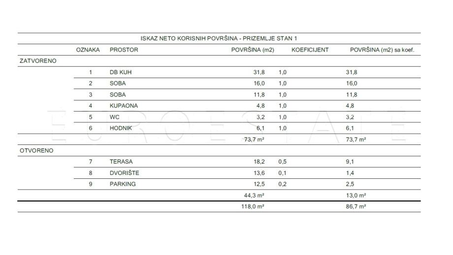 PRODAJE SE trosoban stan u ekskluzivnoj novogradnji smješten u prizemlju urbane vile, ukupne površine 118 m2 i neto korisne (obračunske) površine 86.70 m2.