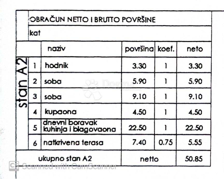 U ponudi je stan A2 na prvom katu zgrade A, s dvije spavaće sobe, prostranim dnevnim boravkom i kuhinjom (ukupno 22,50 m2), kupaonicom (4,50 m2) te natkrivenom terasom 7,40 (obračunato 5,55 m2 po koeficijentu).